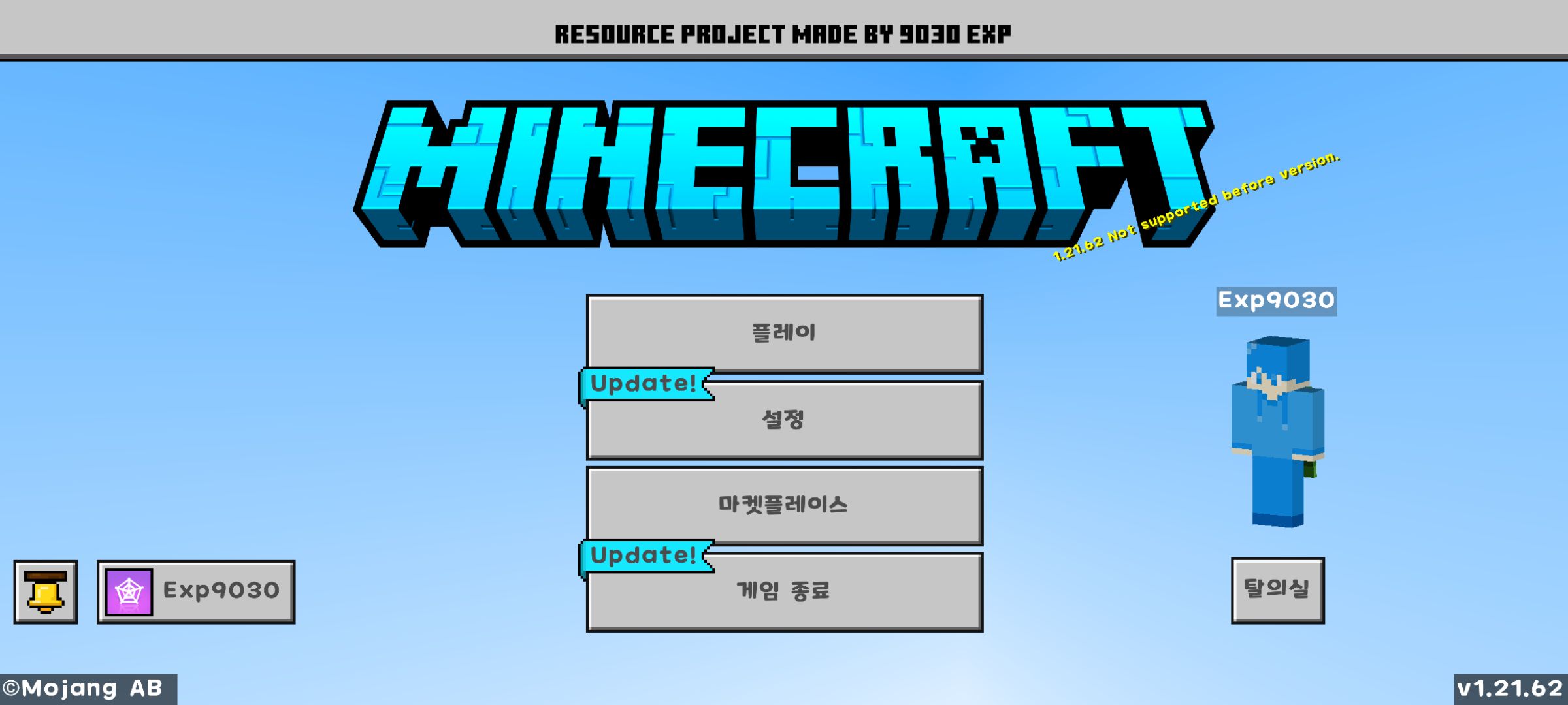 제가 현재 작업중인 리소스팩입니다! :D 원래는 맵접속할때 로딩창이 바뀌었었는데 버그가 있는 관계로 progress_screen.json 에서 .json을 지워놨습니다. [패치노트] 1.새로운 로딩스크린 이용불가. 2.알림창 디자인 변경 3.경험치바 디자인변경 4.하드코어모드 on/off 사운드 변경 5.타이틀 메뉴 음악 변경(두가지) 6.인벤토리,상자 등(채팅 제외) 상호작용할경우 어두워지는 현상 "보이지않음" 으로 변경 7.설정창 크레딧 버튼 추가 8.타이틀메뉴 종료버튼 추가 9.토템 텍스쳐 변경